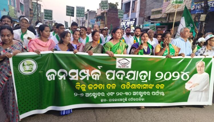 ଗଜପତି(ପ୍ରବୀଣ କୁମାର ଲିମା): ଗଜପତି ଜିଲ୍ଲା ସଦର ମହକୁମା ପାରଳାଖେମୁଣ୍ଡି ସହରରେ ଆଜି ପାରଳା ବିଧାୟକଙ୍କ ନେତୃତ୍ୱରେ ବିଜୁ ଜନତା ଦଳର ଜନସମ୍ପର୍କ ପଦଯାତ୍ରା ଅନୁଷ୍ଠିତ ହୋଇଯାଇଛି l ଏହି ଜନସମ୍ପର୍କ ପଦଯାତ୍ରାରେ ମୁଖ୍ୟ ଅତିଥି ଭାବେ ରାଜ୍ୟ ବିଜେଡ଼ି ସମନ୍ନିୟ କମିଟି ଅଧକ୍ଷ ଦେବି ପ୍ରସାଦ ମିଶ୍ର, ବିଜେଡ଼ି ମୁଖପାତ୍ର ଭୃଗୁ ବକ୍ସସି ପାତ୍ର, ଜିଲ୍ଲା ସଭାପତି ଜଗବନ୍ଧୁ ଦାସ, ରାଜ୍ୟ ସମ୍ପାଦକ ପ୍ରଦୀପ ନାଇକ, ଏବଂ ବିଭିନ୍ନ ବ୍ଲକରୁ ଆସିଥିବା ଅଧକ୍ଷ ଓ ଅଧକ୍ଷା, ସରପଞ୍ଚ ସମିତି ସଭ୍ୟ ସଭ୍ୟା ଏବଂ ବିଜୁ ଜନତା ଦଳର ବିଜୁ କର୍ମୀମାନେ ଯୋଗଦେଇ ରାଜନଗରରୁ ଆରମ୍ଭ ହୋଇ ପୌର ପରିଷଦ ପର୍ଯ୍ୟନ୍ତ ଏହି ଜନସମ୍ପର୍କ ପଦଯାତ୍ରା ଅନୁଷ୍ଠିତ ହାଇଥିଲା l ଏହି ପଦଯାତ୍ରାରେ ଭାରତୀୟ ଜନତା ପାର୍ଟିର ମିଥ୍ୟା ପ୍ରତିଶୃତି ଦରଦାମ ବୃଦ୍ଧି ମଦମୁକ୍ତ ଓଡିଶା ଏହି କେତେକ ମିଛ ପ୍ରତିଶୃତି ବିରୁଦ୍ଧରେ ଜନସାଧାରଣଙ୍କୁ ସଚେତନତା କରାଯାଇଥିଲା l ଭାରତୀୟ ଜନତା ଦଳ ଉପରେ ବର୍ଷୀଲେ ରାଜ୍ୟ ବିଜେଡ଼ି ନେତା ଦେବି ପ୍ରସାଦ ମିଶ୍ର ବିଜେପିକୁ ରଙ୍ଗ ବଦଳାଇ ବା ନାମ ପରିବର୍ତ୍ତନ କରିବା ଦଳ କହିବା ସହ ପାରଳା ବିଧାୟକ ଶ୍ରୀ ରୁପେଶ ପାଣିଗ୍ରାହୀଙ୍କ ପରିଚାଳନା ରେ ଏହି ଜନସମ୍ପର୍କ ପଦଯାତ୍ରା ହୋଇଥିଲା l