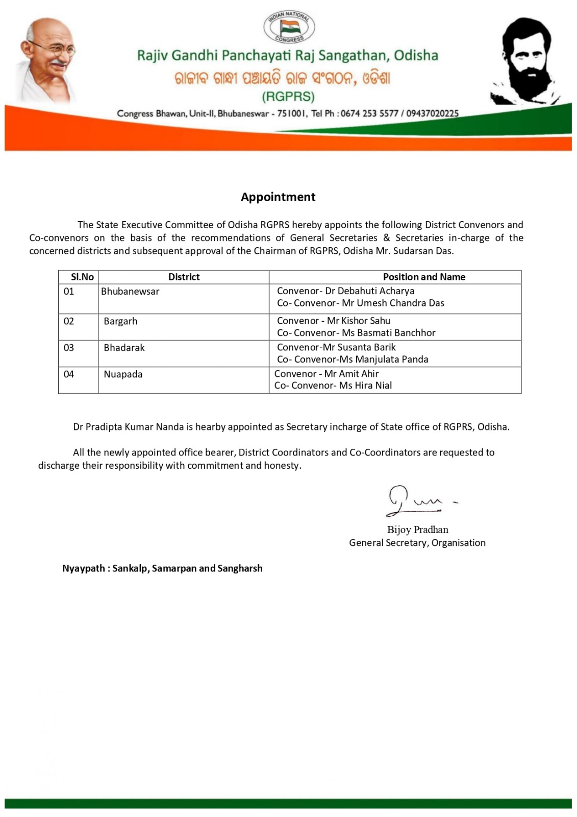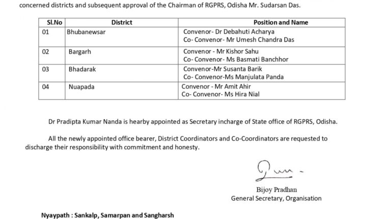 ରାଜୀବ ଗାନ୍ଧୀ ପଞ୍ଚାୟତି ରାଜ ସଂଗଠନର ୪ଟି ଜିଲ୍ଲାର ଆବାହକ ଓ ସହ ଆବାହକ ନିଯୁକ୍ତ, “ଡ. ପ୍ରଦୀପ୍ତ କୁମାର ନନ୍ଦଙ୍କୁ ରାଜ୍ୟ ଅଫିସ ସମ୍ପାଦକ ଦାୟିତ୍ଵ..