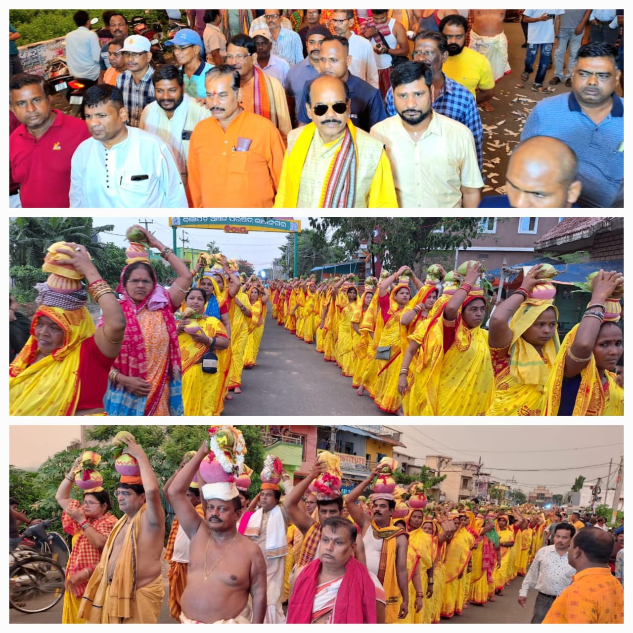 ଭଞ୍ଜନଗର(ନିଲୁ ବିଷୋୟୀ): ଭଞ୍ଜନଗର ମାଁ କୟାଁ ବ୍ୟାଘ୍ରଦେବୀ ମନ୍ଦିର ଓ ବିଗ୍ରହ ପ୍ରତିଷ୍ଠା ଉତ୍ସବ ପାଇଁ ଗୁରୁବାର ଅପରାହ୍ନରେ ବିରାଟ କଳସ ଯାତ୍ରା ଅନୁଷ୍ଠିତ ହୋଇଛି । ପ୍ରାୟ ୫୦୦ରୁ ଉର୍ଦ୍ଧ ମହିଳା ସହର ଉପକଣ୍ଠ ବରଙ୍ଗ କେନାଲରୁ ପାଣି କଳସରେ ଆଣିଥିଲେ । ସେଠାରେ ପୂଜାର୍ଚ୍ଚନା ପରେ ନଦିଆ କିର୍ତ୍ତନ, ଘଣ୍ଟବାଦ୍ୟ, ବାଣ ବାଜା ପଟୁଆର୍ରେ ଶୋଭାଯାତ୍ରା ସହର ପରିକ୍ରମା କରି ଯଜ୍ଞସ୍ଥଳରେ ଶୋଭାଯାତ୍ରା ପହଞ୍ଚିଥିଲା । ସେଠାରେ ନାମଯଜ୍ଞ ମଣ୍ଡପର ଅଧିବାସ ପରେ ଆସନ୍ତାକାଲି ଠାରୁ ନାମଯଜ୍ଞ ଆରମ୍ଭ ହେବ । ଏଥିସହ ମନ୍ଦିର ପ୍ରତିଷ୍ଠା ନେଇ ମଧ୍ୟ ରୀତିନୀତି ଆରମ୍ଭ ହେବ । ଏଥିରେ ପଣ୍ଡିତ ଉପେନ୍ଦ୍ର ମିଶ୍ର, ଅନିଲ ଶତପଥୀ, ପ୍ରମୋଦଷଡ଼ଙ୍ଗୀ, ସୁବାଷ ଚନ୍ଦ୍ର ମିଶ୍ର, ସୁରେନ୍ଦ୍ର ତ୍ରିପାଠୀ, ବୁଲୁ ମହାପାତ୍ର, ତ୍ରିଲୋଚନ ଦାଶ ଓ ରମେଶ ଚନ୍ଦ୍ର ଦାଶ ପୂଜାପାଠ ସମ୍ପାଦନ କରିଥିଲେ । ଅମ୍ବିକା ଶତପଥୀ ଓ ପତ୍ନୀ ସ୍ନିଗ୍ଧା ଶତପଥୀ କର୍ତ୍ତା ଦାୟିତ୍ୱ ତୁଲାଇଥିଲେ । ବିଧାୟକ ପ୍ରଦ୍ୟୁମ୍ନ କୁମାର ନାୟକଙ୍କ ପ୍ରତ୍ୟକ୍ଷ ତତ୍ତ୍ଵାବଧାନରେ କମିଟି ସଭାପତି ପ୍ରମୋଦ କୁମାର ଦଳବେହେରା, ସୁବାଷ ଚନ୍ଦ୍ର ପ୍ରଧାନ, ଶ୍ରୀରାମ ପ୍ରସାଦ ପାଳ, ପ୍ରସନ୍ନ କୁମାର ନାୟକ ଓ ସୁବାଷ ଚନ୍ଦ୍ର ବରାଡ଼ଙ୍କ ସମେତ ବହୁ ଶ୍ରଦ୍ଧାଳୁ ଏଥିରେ ସାମିଲ ହୋଇଥିଲେ । ଆସନ୍ତା ୯ ତାରିଖ ପର୍ଯ୍ୟନ୍ତ ଦୈନିକ ପ୍ରାୟ ୧୫ହଜାରରୁ ଉର୍ଦ୍ଧ ଶ୍ରଦ୍ଧାଳୁଙ୍କ ସମାଗମ ହେବାକୁ ଥିବା ବେଳେ ପ୍ରସାଦ ସେବନ ମଧ୍ୟ ଜାରି ରହିବ । ପ୍ରଫୁଲ ଚନ୍ଦ୍ର ପଟ୍ଟନାୟକ, ରାଘବନନ୍ଦ ଆଚାର୍ଯ୍ୟ, ବିଷ୍ଣୁପ୍ରସାଦ ପ୍ରଧାନ, ମୁରଲୀଧର ପଣ୍ଡା, ସୁଧୀର ରଞ୍ଜନ ବେହେରା, କଳ୍ପତରୁ ନାୟକ, ଗୋପାଳ କୃଷ୍ଣ ପାଣିଗ୍ରାହୀ, ଚିଦାନନ୍ଦ ପ୍ରଧାନ, ଦିଲ୍ଲୀପ ପଟ୍ଟନାୟକ,ବିପଦର ବନ୍ଧୁ ଓ ଜୟଶ୍ରୀ ହନୁମାନ ସ୍ବେଚ୍ଛସେବୀ ସଂଘର ସଦସ୍ୟମାନେ ପ୍ରମୁଖ କାର୍ଯ୍ୟକ୍ରମରେ ସାମିଲ ରହିଛନ୍ତି ।