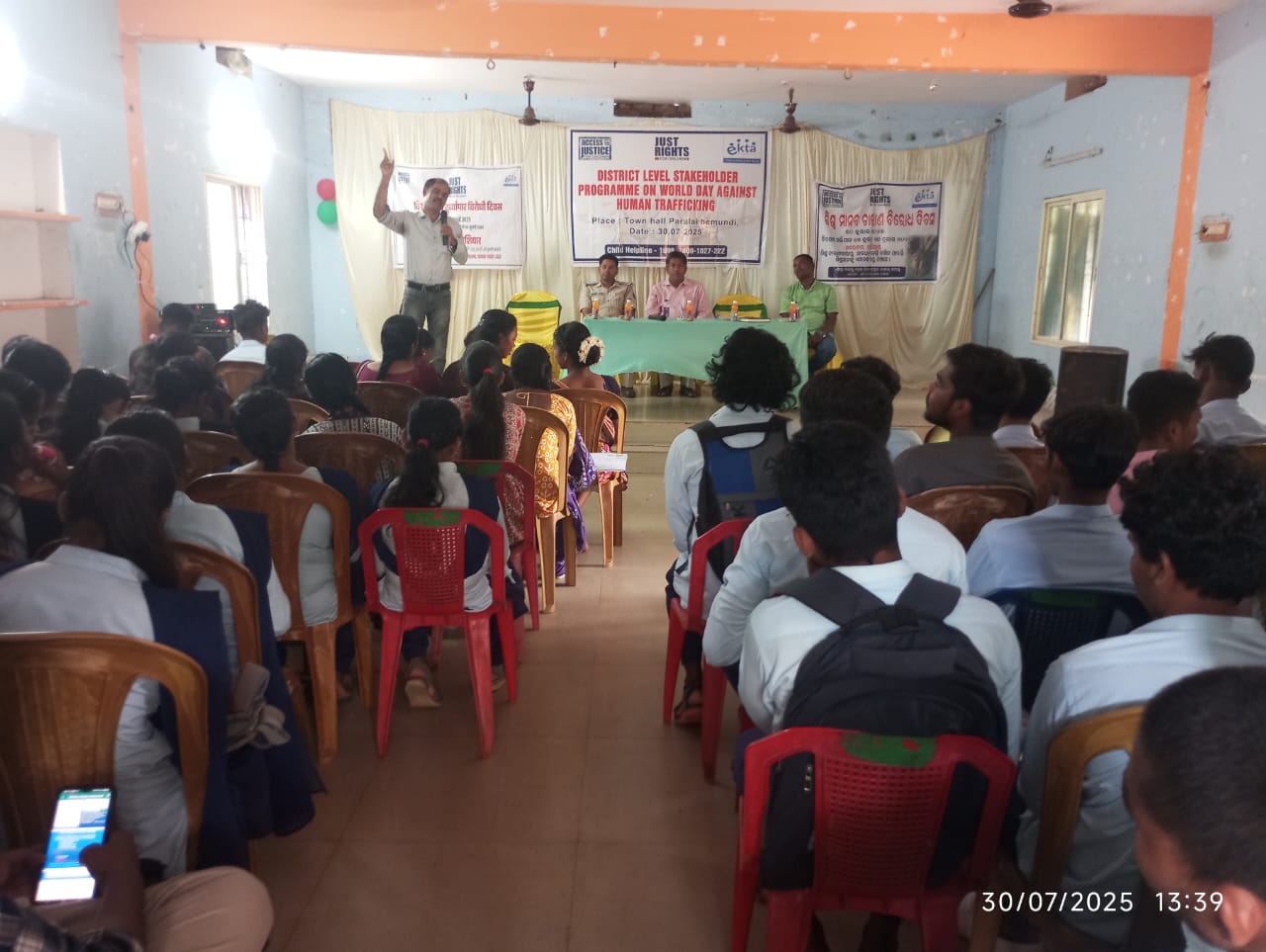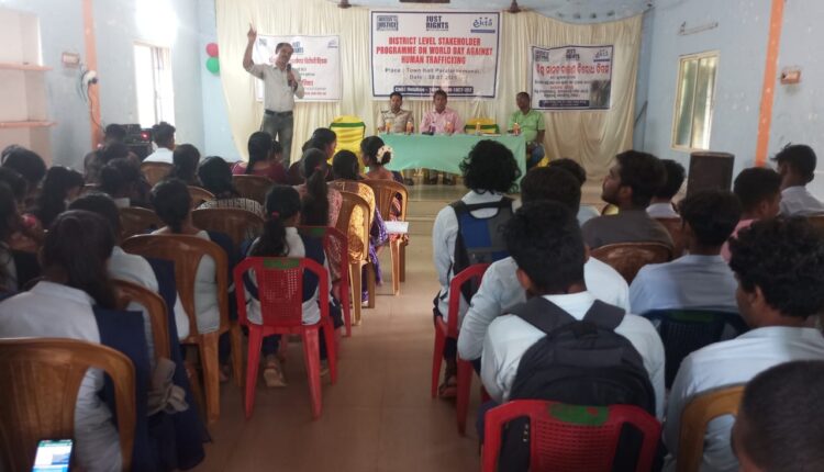 ପାରଳାଖେମୁଣ୍ଡି(ପ୍ରବୀଣ କୁମାର ଲିମା): ଗଜପତି ଜିଲ୍ଲା ପାରଳାଖେମୁଣ୍ଡି ସଦରମହକୁମାରେ ଆଜି ବିଶ୍ୱ ମାନବ ଚାଳନା ବିରଧ ଦିବସ ପାଳନ କରାଯାଇଛି l ଭାରତ ବର୍ଷରେ ହେଉଥିବା ମାନବ ଓ ଶିଶୁ ଚାଳନ ବହୁତ ମାତ୍ରାରେ ହେଉଛି ଏବଂ ଛୋଟ ଶିଶୁମାନଙ୍କୁ ଦୁଷ୍କର୍ମ ହେଉ ବା ଛୋଟ ପିଲାମାନଙ୍କ କାମ କରିବା ପ୍ରତି ମୁହୂର୍ତରେ ଶିଶୁମାନଙ୍କର ଅଧିକାର ଓ ଭବିଷ୍ୟତ ନଷ୍ଟ ହେଉଥିବା ଯୋଗୁଁ ଆଜି ekta right for children ତରଫରୁ ଗୋଟିଏ ଦିନ ଜିଲ୍ଲାସ୍ତରୀୟ କାର୍ଯ୍ୟକ୍ରମ ଆୟୋଜନ କରାଯାଇଛି l ମୁଖ୍ୟ ଅତିଥି ଭାବେ ଜିଲ୍ଲା ଶିଶୁ କଲ୍ୟାଣ କମିଟି ଅଧିକାରୀ ଅଶ୍ୱିନୀ କୁମାର ମୁଖ୍ୟଅତିଥି ଭାବେଯୋଗ ଦେଇ ଥିବା ବେଳେ ଜିଲ୍ଲା ଶିଶୁ ସୁରକ୍ଷା ଅଧିକାରୀ ଅରୁଣ କୁମାର ତ୍ରିପାଠୀ, 1098 ଚାଇଲଡ ହେଲ୍ପ ଲାଇନର ବୈଶାଳୀ ପଟନାୟକ, ସୁରଜ ଲିମା, ଟାଉନ ଥାନା ଅଧିକାରୀ ପି ସ୍ୱାଇଁ, କେ ସେଠି ଏବଂ ekta just right for children ନିର୍ଦେଶକ ପ୍ରଭାତ କୁମାର ପାଇକରାଇ ଓ ଏକ୍ତା ଷ୍ଟାପ ପ୍ରିୟାରୀ କୁଜୁର, ଅନିତା ନାଇକ, ଗୀତା ଦୋରା, ଉପସ୍ଥିତ ଥିଲେ l ଏହି କାର୍ଯ୍ୟକ୍ରମ ଟାଉନ ହଲରେ ଆୟୋଜିତ କରାଯାଇ ଥିଲା ଏବଂ ଏସ କେ ସି ଜି ଛାତ୍ର ଛାତ୍ରୀମାନେ ଉପସ୍ଥିତ ହୋଇଥିଲେ l