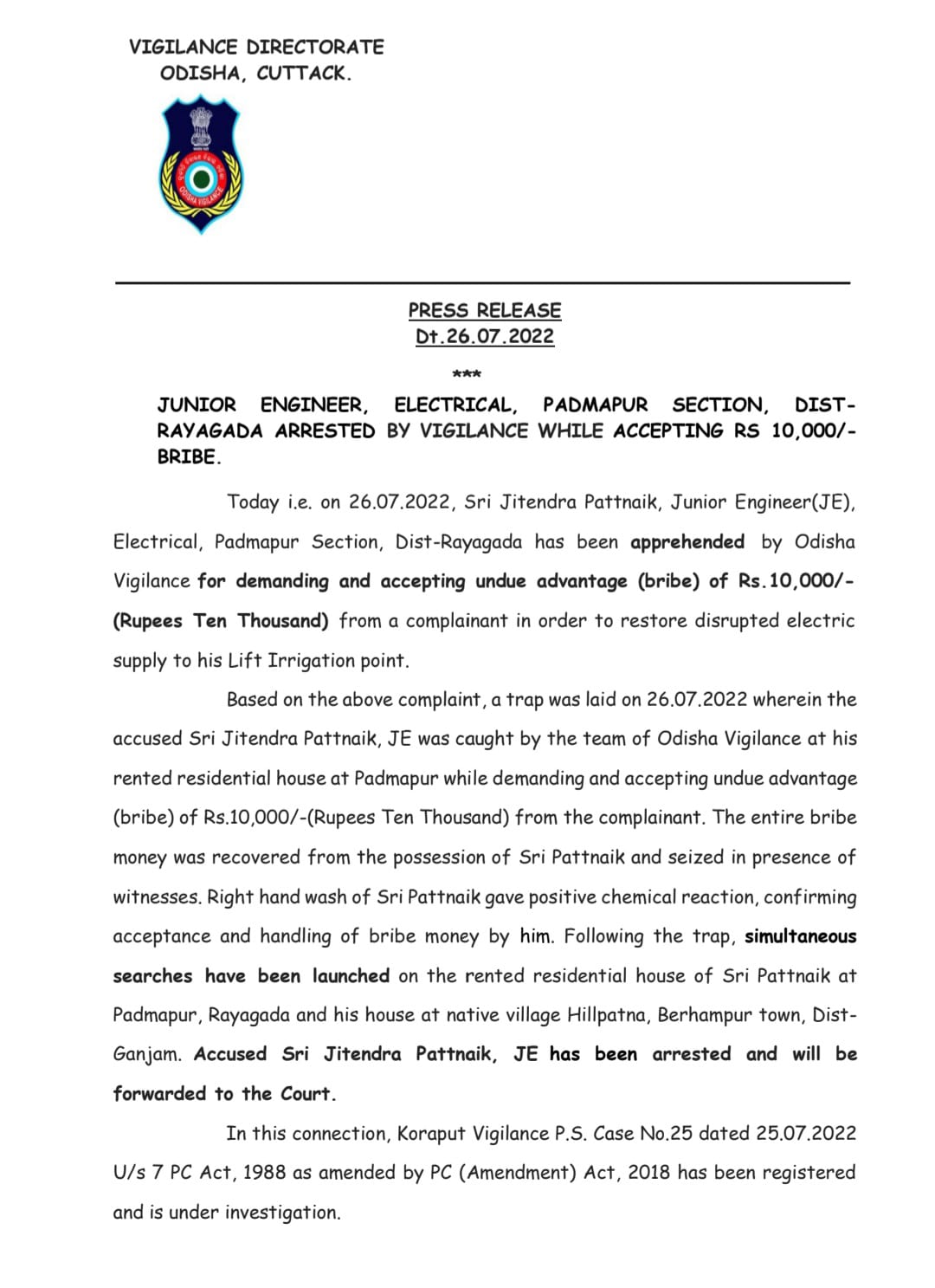 ଅନୁସନ୍ଧାନ ଭାରତ(ବ୍ୟୁର): ଭିଜିଲାନ୍ସ ଜାଲରେ ଫସିଲେ ରାୟଗଡା ଜିଲ୍ଲାର ପଦ୍ମପୁର ବିଦ୍ୟୁତ ବିଭାଗର କନିଷ୍ଟ ଯନ୍ତ୍ରୀ ଜିତେନ୍ଦ୍ର ପଟ୍ଟନାୟକ l ଜଣେ ଲୋକଙ୍କ ଠାରୁ ଦଶ ହଜାର ଟଙ୍କା ଲାଞ୍ଚ ନେବା ବେଳେ ଧରିଲା କୋରାପୁଟ ଭିଜିଲାନ୍ସ ବିଭାଗ । ପଦ୍ମପୁରର ଭଡା ଘରୁ ଧରିଲା ଭିଜିଲାନ୍ସ ଟିମ l ଭିଜିଲାନ୍ସ ଦ୍ୱାରା 25/2022 ଓ ଦଫା ୭ PC Act 1988 as amended by PC Amendment Act 2018ରେ ମାମଲା ରୁଜୁ କରାଯାଇ କୋରାପୁଟ ଭିଜିଲାନ୍ସ ଦ୍ୱାରା ଜୁନିଅର ଯନ୍ତ୍ରୀ ଗିରଫ ହେବା ପରେ ଆସନ୍ତାକାଲି କୋର୍ଟ ଚାଲାଣ ହେବ ବୋଲି ସୂଚନା ଦେଲେ ଭିଜିଲାନ୍ସ ଡି ଏସ ପି ସୁରେନ୍ଦ୍ର ନାଥ ରାୟଗୁରୁ ଦେଇଛନ୍ତି l