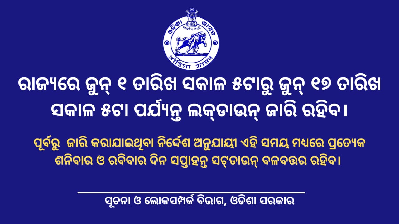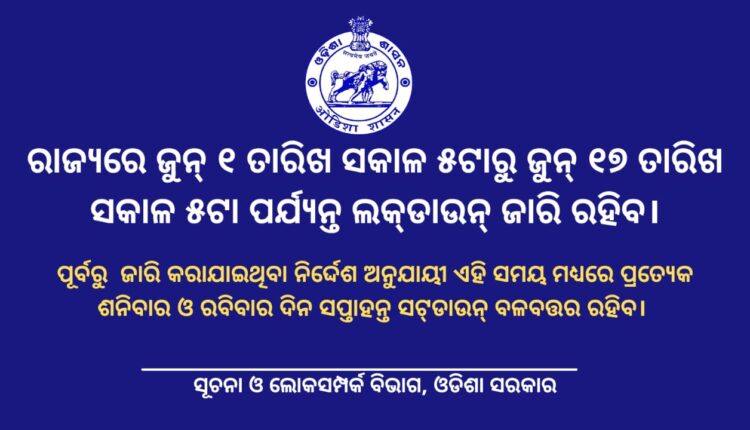 ଅନୁସନ୍ଧାନ ଭାରତ(ବ୍ୟୁର): ପୁଣି ରାଜ୍ୟରେ ଜୁନ ୧୭ ପର୍ଯ୍ୟନ୍ତ ବଢିଲା ଲକ୍ଡାଉନ୍I ଏହା ଛଡା ସପ୍ତାହନ୍ତ ସଟଡାଉନ୍ ବଳବତ୍ତର ରହିବ I କରୋନା ସଂକ୍ରମଣ ରୋକିବା ପାଇଁ ରାଜ୍ୟ ସରକାର ଜୁନ ୧ ସକାଳ ୫ଟାରେ ସରୁଥିବା ଲକ୍ଡାଉନ୍ ଅବଧିକୁ ଜୁନ ୧୭ ସକାଳ ୫ଟା ପର୍ଯ୍ୟନ୍ତ ବୃଦ୍ଧି କରିଛନ୍ତି I