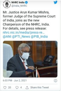 ଅନୁସନ୍ଧାନ ଭାରତ(ବ୍ୟୁର): ଅବସରପ୍ରାପ୍ତ ବିଚାରପତି ଜଷ୍ଟିସ୍ ଅରୁଣ କୁମାର ମିଶ୍ର ଆଜି ଜାତୀୟ ମାନବାଧିକାର ଆୟୋଗର ଅଧ୍ୟକ୍ଷ ଭାବେ ଦାୟିତ୍ୱ ଗ୍ରହଣ କରିଛନ୍ତି I ରାଷ୍ଟ୍ରପତି ରାମନାଥ କୋବିନ୍ଦ ଜଷ୍ଟିସ୍ ମିଶ୍ରଙ୍କୁ ଏହି ନିଯୁକ୍ତି ପ୍ରଦାନ କରିଛନ୍ତି I ଏଥିପାଇଁ ଏକ ଉଚ୍ଚସ୍ତରୀୟ କମିଟି ଜଷ୍ଟିସ୍ ମିଶ୍ରଙ୍କ ନାମ ସୁପାରିଶ କରିଥିଲା I