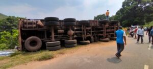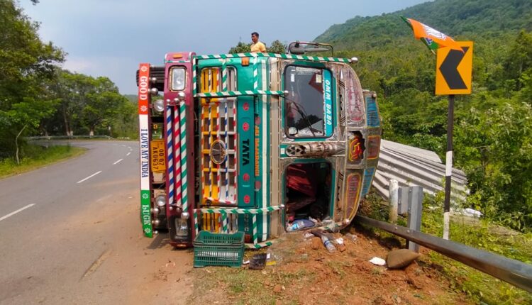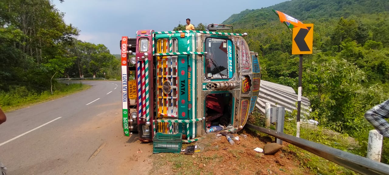 ଅନୁସନ୍ଧାନ ଭାରତ(ବ୍ୟୁର): କନ୍ଧମାଳ ଜିଲ୍ଲା ଘୁ. ଉଦୟଗିରି ସ୍ଥିତ ପଣସ ବାଙ୍କୀ ଠାରେ ଭାରସାମ୍ୟ ହରାଇ ଏକ ଆଜବେଷ୍ଟସ ଟ୍ରକ ଦୁର୍ଘଟଣା ଗ୍ରସ୍ଥ ହୋଇଛି I ହେଲେ ଏହି ବଡ଼ ଦୁର୍ଘଟଣାରେ ମୃତ୍ୟୁ ମୁଖରୁ ଅଳ୍ପକେ ବର୍ତ୍ତିଲେ ଟ୍ରକ ଡ୍ରାଇଭର ଓ ହେଲପର I ସୂଚନା ଅନୁସାରେ ସ୍ଥାନୀୟ ନନ୍ଦଗିରି ନିକଟସ୍ଥ ପଣସ ବାଙ୍କୀ ଠାରେ ଆଜି ଅପରାହ୍ନରେ ଏକ ଚଉଦ ଚକିଆ ଆଜବେଷ୍ଟ ବୋଝେଇ ଟ୍ରକ ଯାହାର ନମ୍ବର OD-07 AK 0637 ଦୁର୍ଘଟଣା ଗସ୍ତ ହୋଇଛି I