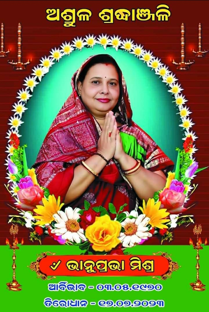 ଅନୁସନ୍ଧାନ ଭାରତ(ବ୍ୟୁର): କନ୍ଧମାଳ ଜିଲ୍ଲା ଘୁ.ଉଦୟଗିରି ଏନଏସି ପକ୍ଷରୁ ଏନଏସି ଅଧକ୍ଷା ସ୍ବର୍ଗତ ଭାନୁପ୍ରଭା ମିଶ୍ରଙ୍କ ସ୍ମୃତି ଉଦ୍ଦେଶ୍ୟରେ ଏନଏସି କଲ୍ୟାଣ ମଣ୍ଡପ ଠାରେ ଶ୍ରଦ୍ଧାଞ୍ଜଳି ସଭା ଅନୁଷ୍ଠିତ ହୋଇଛି I
